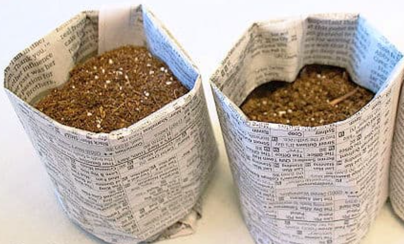 Fold and shape newspaper into small pots using the jar as a mold. Fill them with soil and seeds, then plant the entire paper pot in the ground later. This shows how biodegradable materials can help reduce plastic waste in gardening.